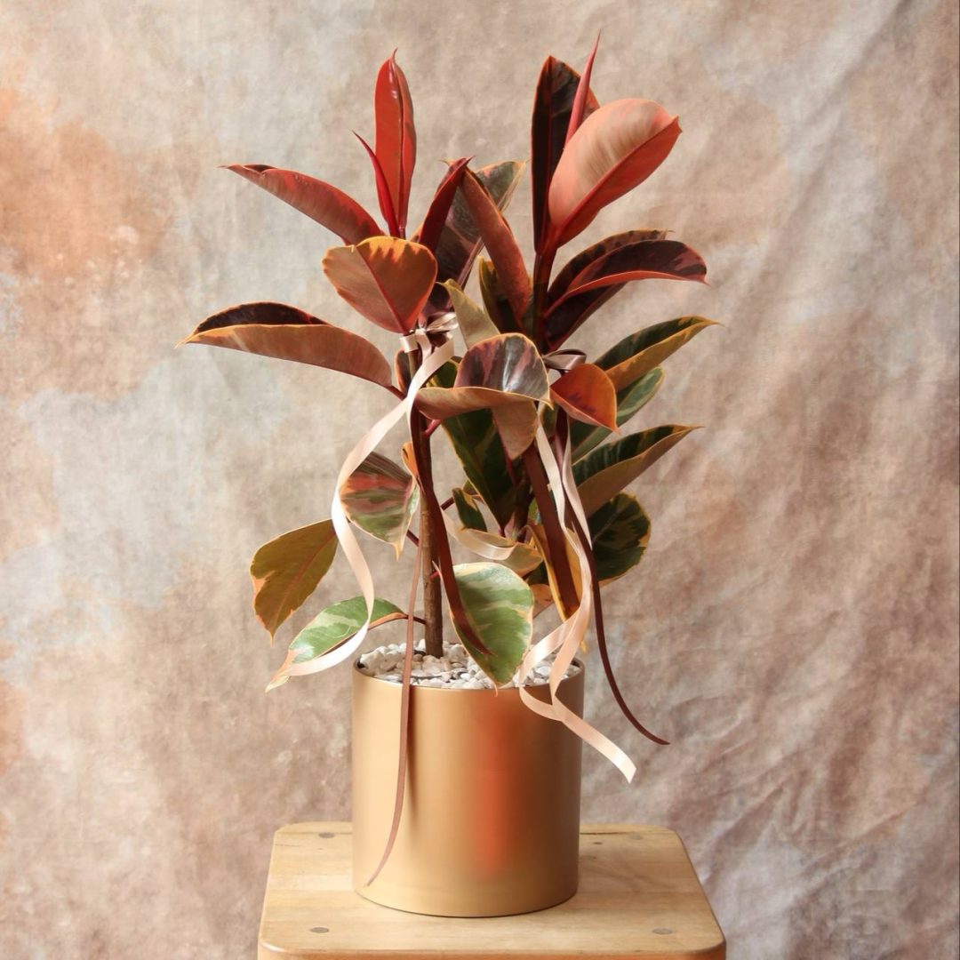 گلدان فیکوس شرابی دو شاخه همراه با گلدان پلیمری