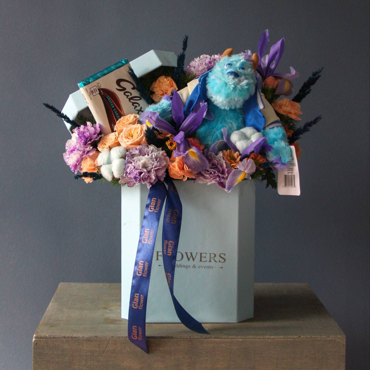 باکس گل آبی با عروسک سالیوان مدل کیلان