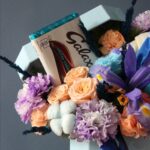گلدان شیشهای با شکلات میلکا و عروسک مدل اسپاکو