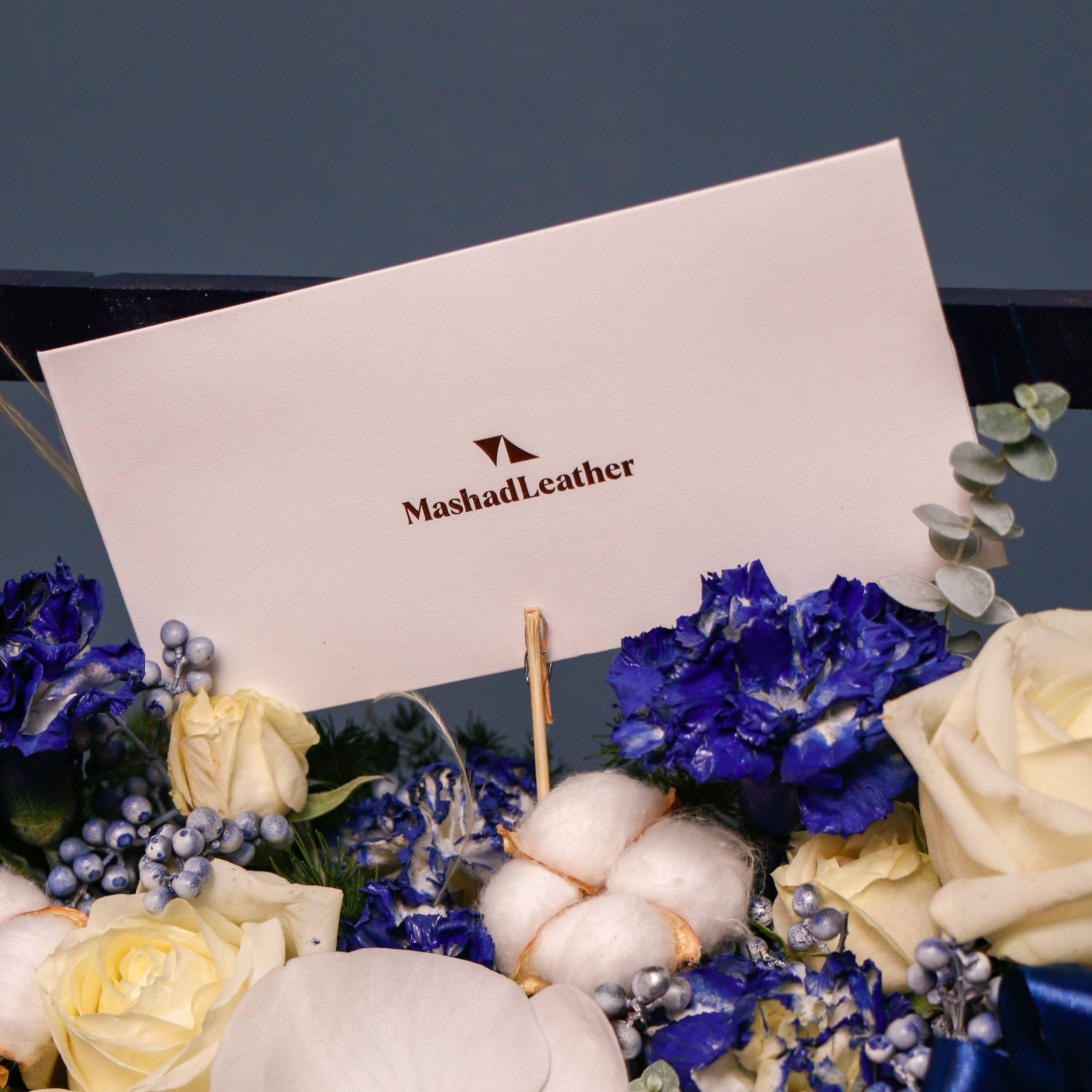باکس گل رز آبی مدل هیوا به همراه گیفت کارت چرم مشهد