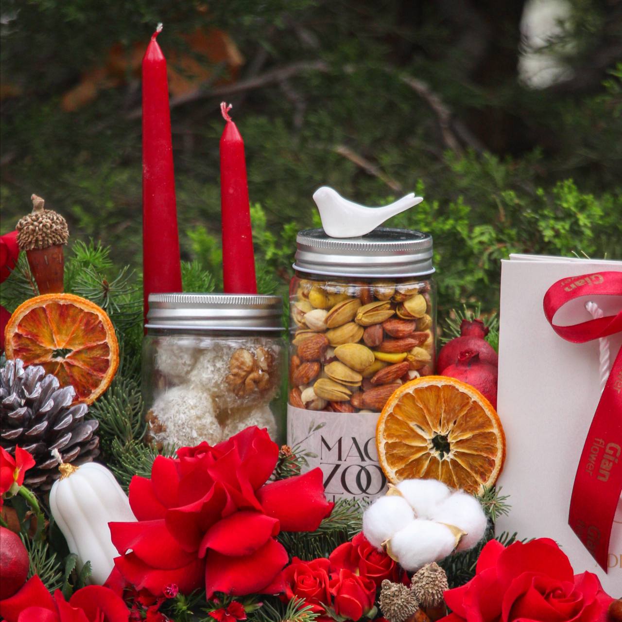 - به همراه اکسسوری یلدایی و آجیل و باسلق، گردنبند طلا، کیک