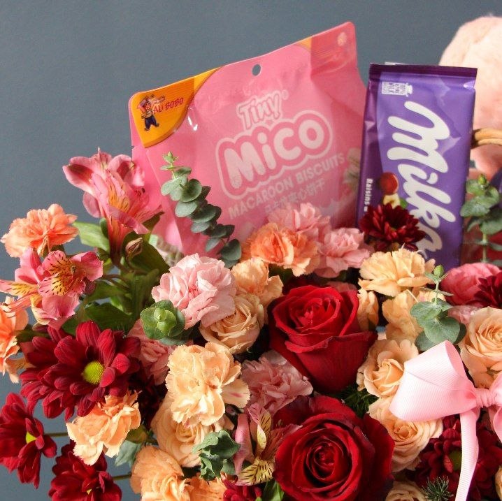 – به همراه یک بسته شیرینی ماکارون، شکلات ملیکا تختهای، شکلات میلکا سکهای، بیسکوییت لیوانی و عروسک - ابعاد: