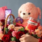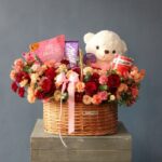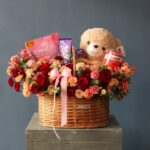 سبد گل رز به همراه عروسک و ماکارون مدل سولاف