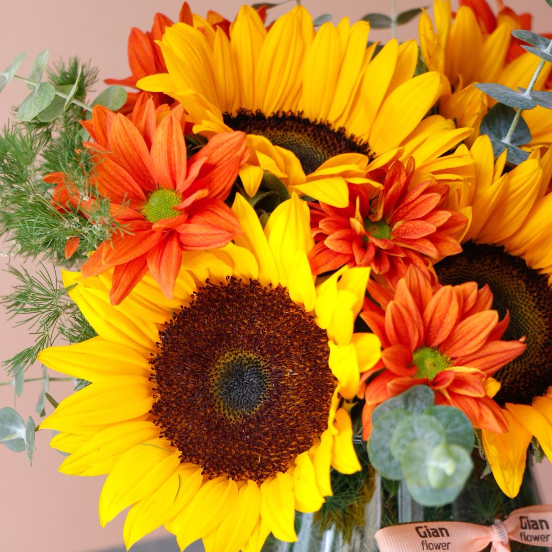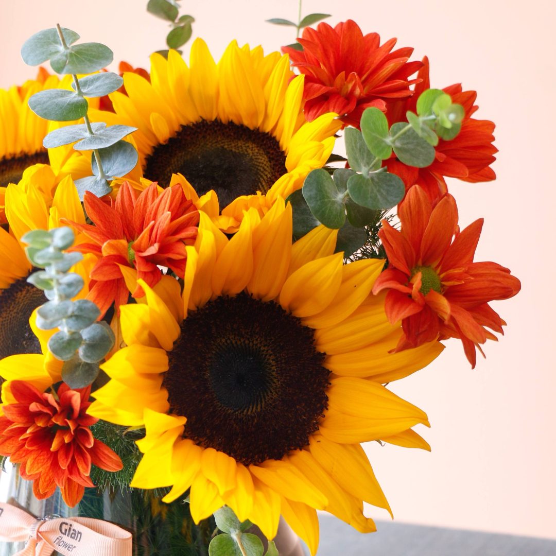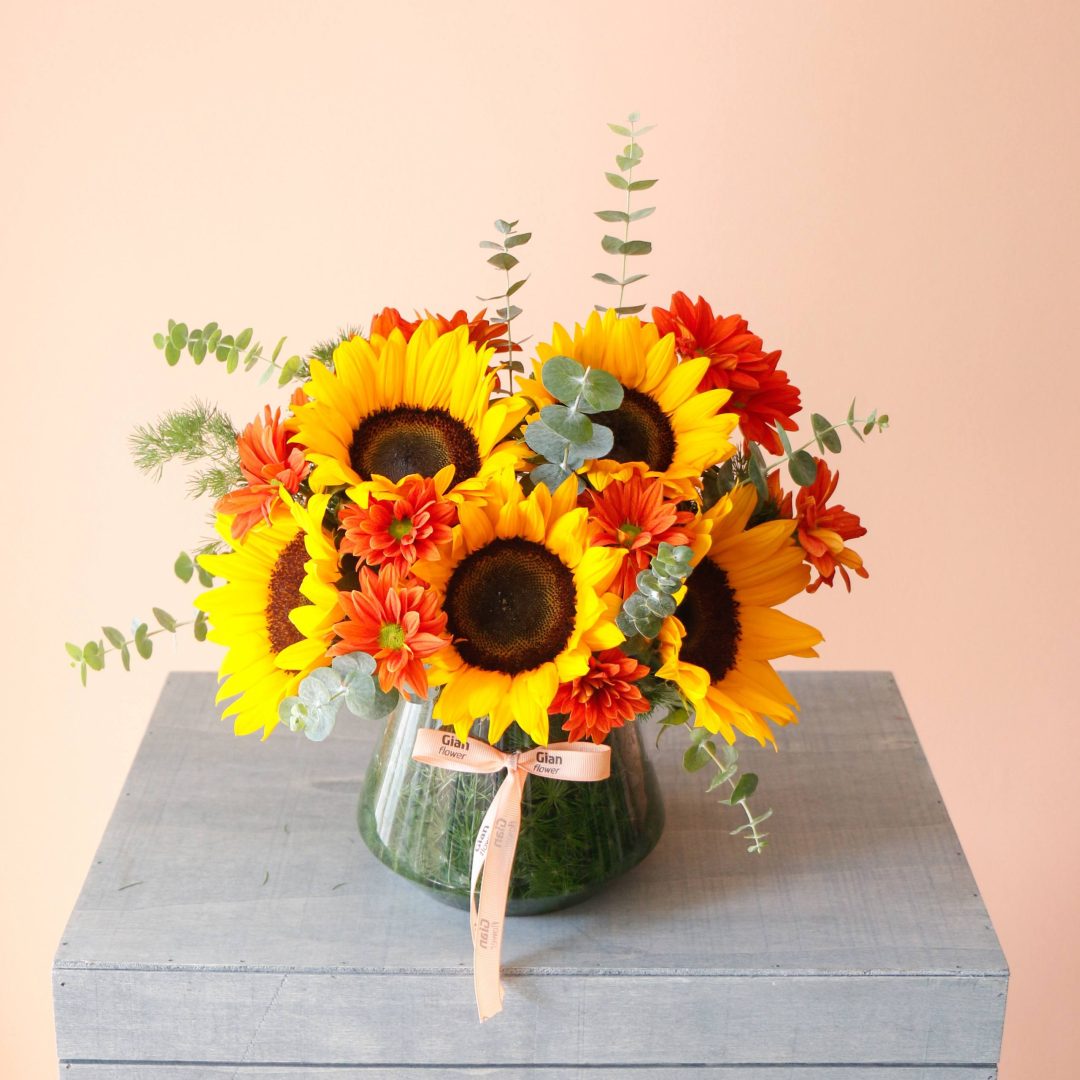 گلدان شیشهای آفتابگردان و داوودی مدل روژمان